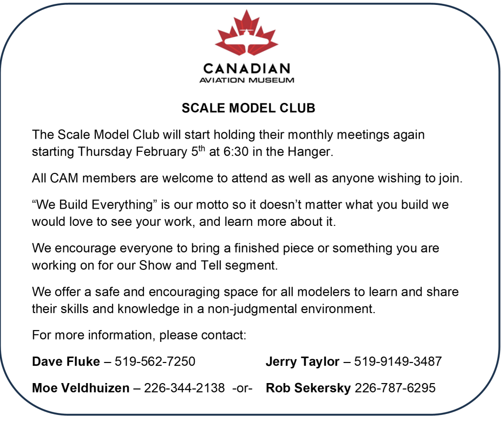 The Scale Model Club will start holding their monthly meetings again starting Thursday February 5th at 6:30 in the Hanger.