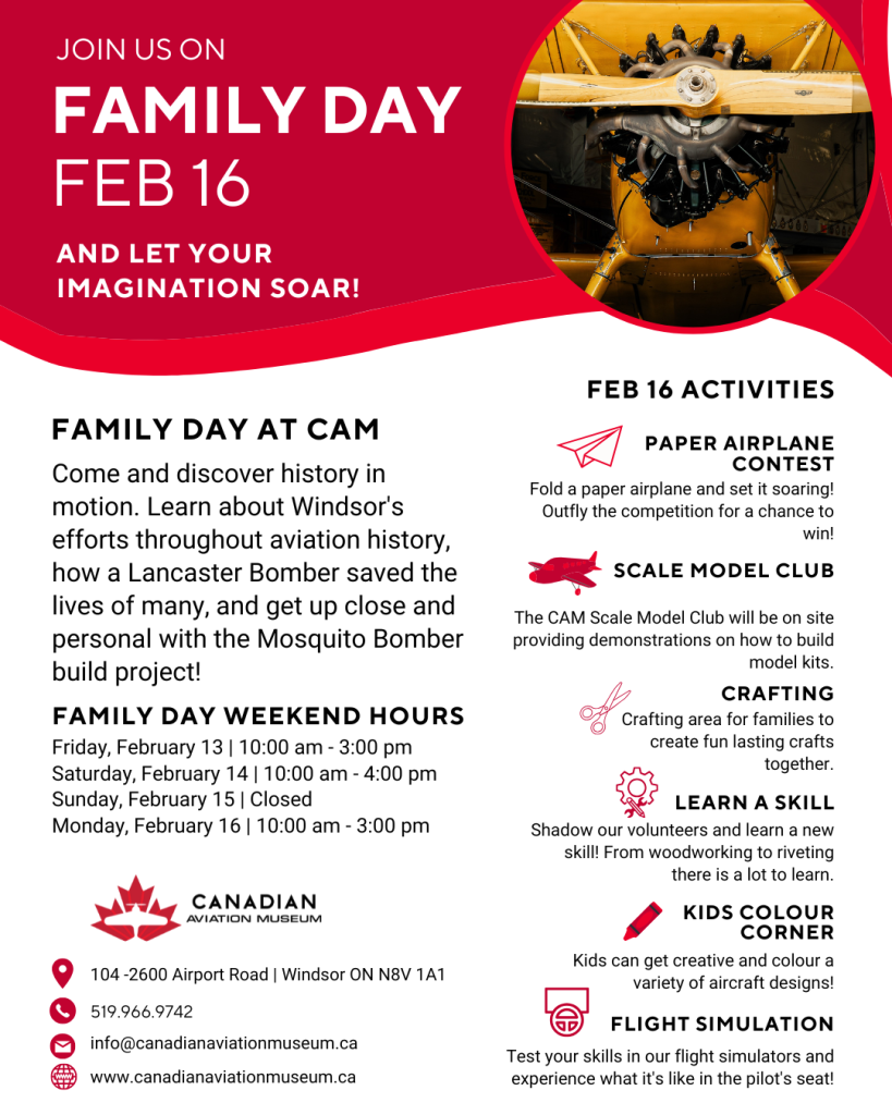 Come and discover history in motion. Learn about Windsor’s efforts throughout aviation history, how a Lancaster Bomber saved the lives of many, and get up close and personal with the Mosquito Bomber build project!